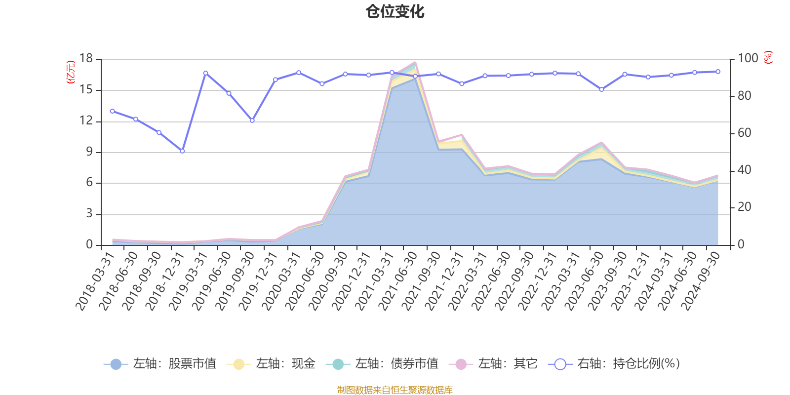 据定期报告数据统计,近三年平均股票仓位为90.81%,同类平均为79.77%。2024年三季度末基金达到93.38%的最高仓位,2018年末最低,为50.64%。