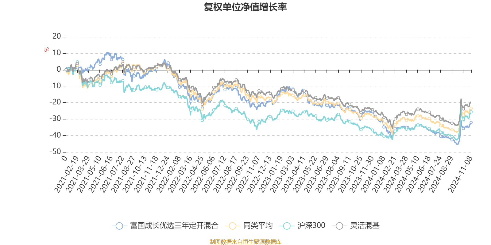 截至11月8日,富国成长优选三年定开混合近三个月复权单位净值增长率为14.45%,位于同类可比基金590/920;近半年复权单位净值增长率为2.27%,位于同类可比基金654/920;近一年复权单位净值增长率为-9.47%,位于同类可比基金840/920;近三年复权单位净值增长率为-31.88%,位于同类可比基金626/892。