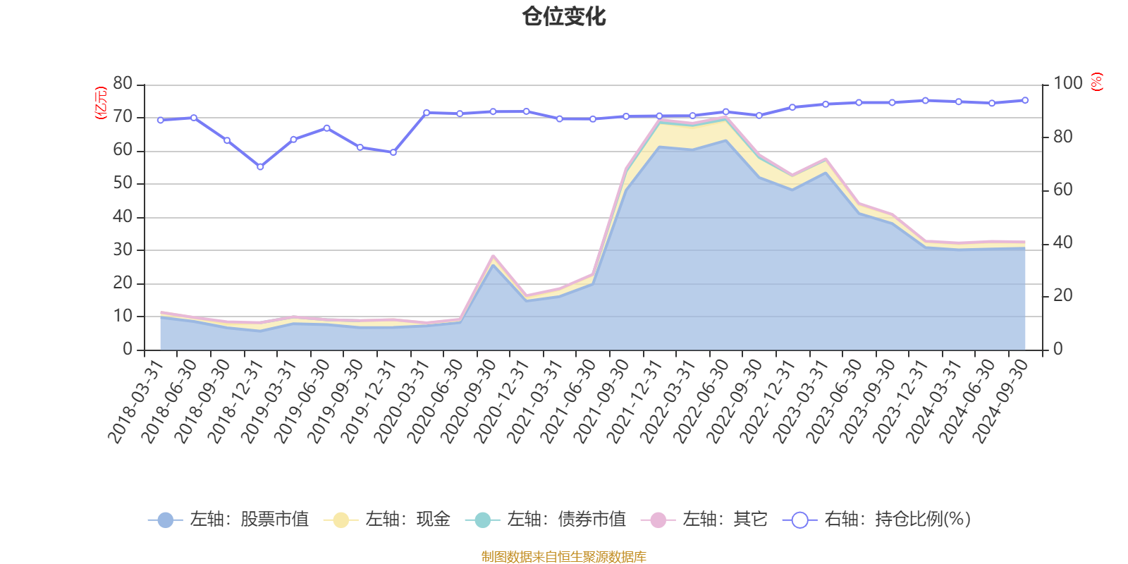 据定期报告数据统计,近三年平均股票仓位为91.66%,同类平均为83.55%。2024年三季度末基金达到94.11%的最高仓位,2018年末最低,为69.04%。