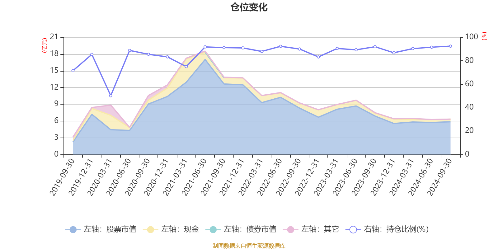 据定期报告数据统计,近三年平均股票仓位为89.82%,同类平均为79.77%。2024年三季度末基金达到92.47%的最高仓位,2020年一季度末最低,为50.2%。
