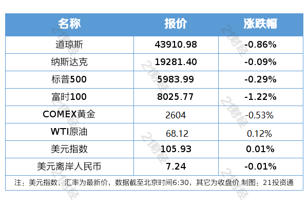 纽约股市三大股指11月12日集体收跌。道指跌近1%。截至当天收盘,道琼斯工业平均指数比前一交易日下跌382.15点,收于43910.98点,跌幅为0.86%;标准普尔500种股票指数下跌17.36点,收于5983.99点,跌幅为0.29%;纳斯达克综合指数下跌17.36点,收于19281.40点,跌幅为0.09%。