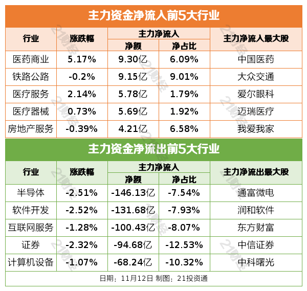11月12日,市场全天冲高回落,沪指领跌。截至收盘,沪指跌1.39%,深成指跌0.65%,创业板指跌0.07%。板块方面,医药商业、能源金属、中药、ST等板块涨幅居前,保险、光刻机、军工装备、多模态AI等板块跌幅居前。