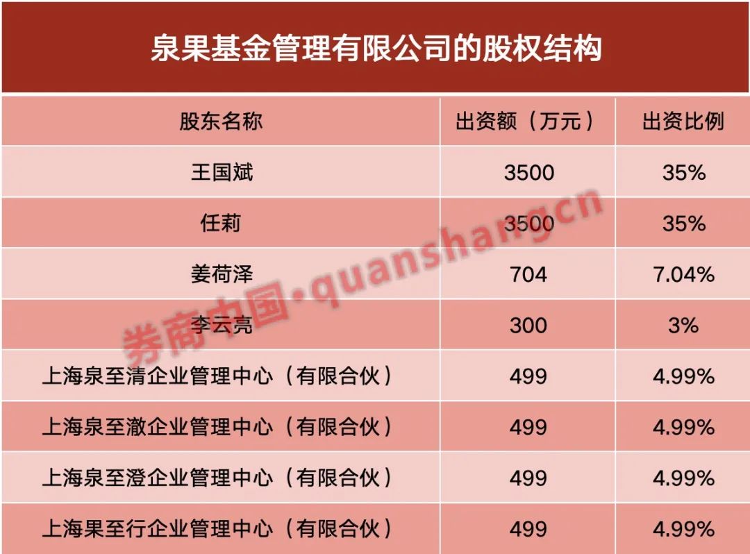泉果基金的股权结构较为集中,主要由创始人和核心管理团队持有。其中,王国斌和任莉是主要股东,各自持有公司35%的股份,姜荷泽持有7.04%的股份,李云亮持有3%的股份。此外,还有四家有限合伙企业:上海泉至清企业管理中心(有限合伙)、上海泉至澈企业管理中心(有限合伙)、上海泉至澄企业管理中心(有限合伙)和上海果至行企业管理中心(有限合伙),各自持有4.99%的股份。