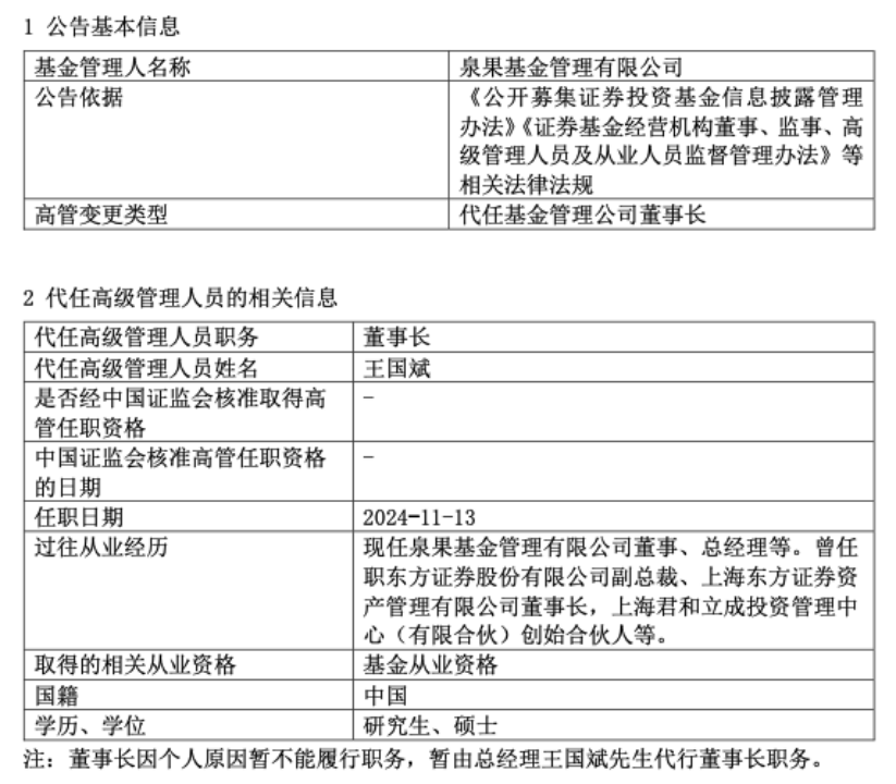 11月13日,泉果基金发布公告,公司董事长任莉因其个人原因暂不能履行职务,暂由总经理王国斌代行董事长职务。