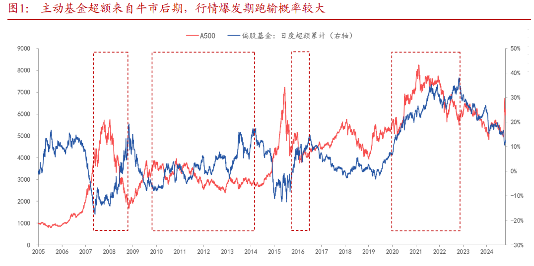 对于主动管理基金而言,浙商证券研报认为,主动基金的超额弹性均出现在牛市后期,行情爆发期跑输指数基金的概率较大。由于仓位、灵活度、考核期等约束,集体性的捕捉快牛行情天然不是主动基金传统优势项目。