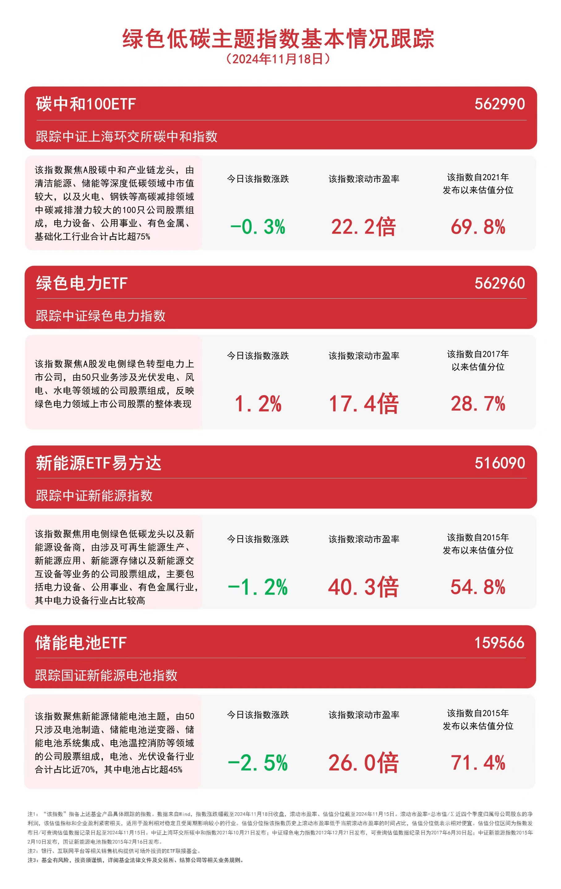 截至收盘,今日中证绿色电力指数上涨1.2%,中证上海环交所碳中和指数下跌0.3%,中证新能源指数下跌1.2%,国证新能源电池指数下跌2.5%。