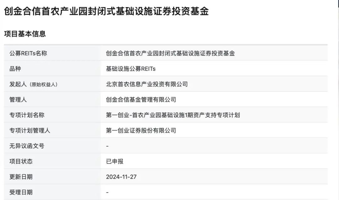 11月27日,上交所官网显示,创金合信首农产业园封闭式基础设施证券投资基金项目状态更新为“已申报”。该项目原始权益人为北京首农信息产业投资有限公司,基金管理人为创金合信基金管理有限公司。