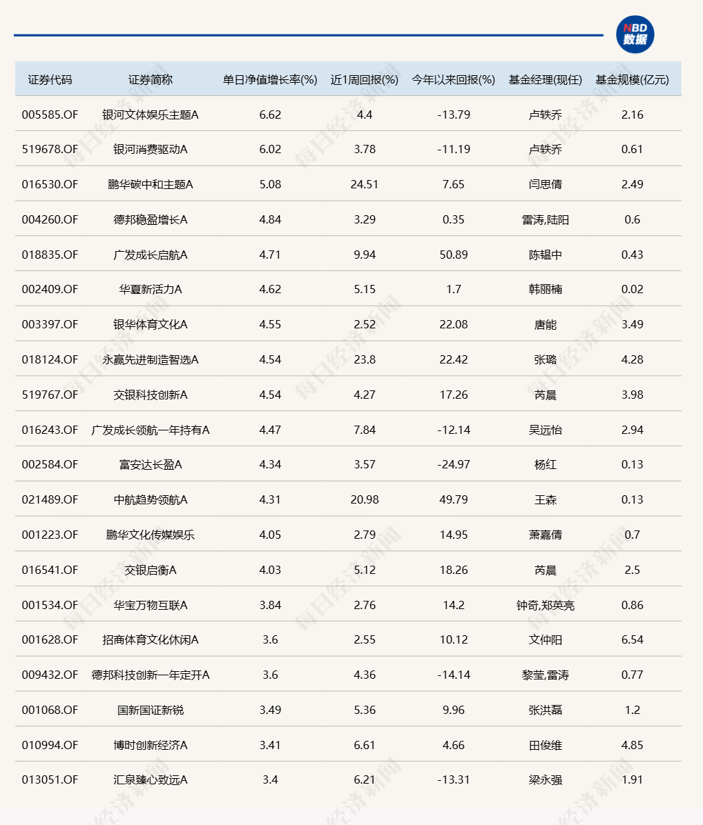 (原标题:两只基金单日涨超6%,均为文娱传媒主题)