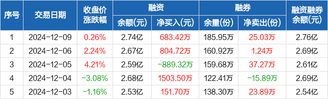 融资方面,当日融资买入6209.97万元,融资偿还5526.56万元,融资净买入683.42万元。融券方面,融券卖出28.03万份,融券偿还3万份,融券余量185.95万份,融券余额212.54万元。融资融券余额合计2.76亿元。