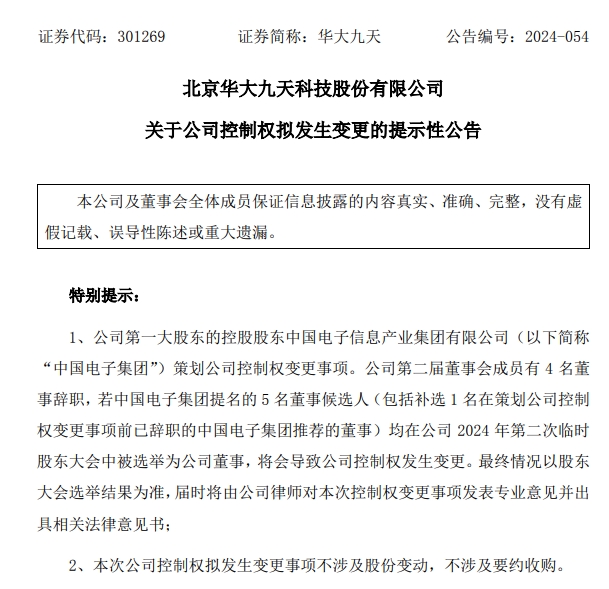 公告显示,华大九天第二届董事会成员有4名董事辞职,若中国电子集团提名的5名董事候选人(包括补选1名在策划公司控制权变更事项前已辞职的中国电子集团推荐的董事)均在2024年第二次临时股东大会中被选举为董事(11席董事中6席系中国电子集团提名),将会导致华大九天控制权发生变更。