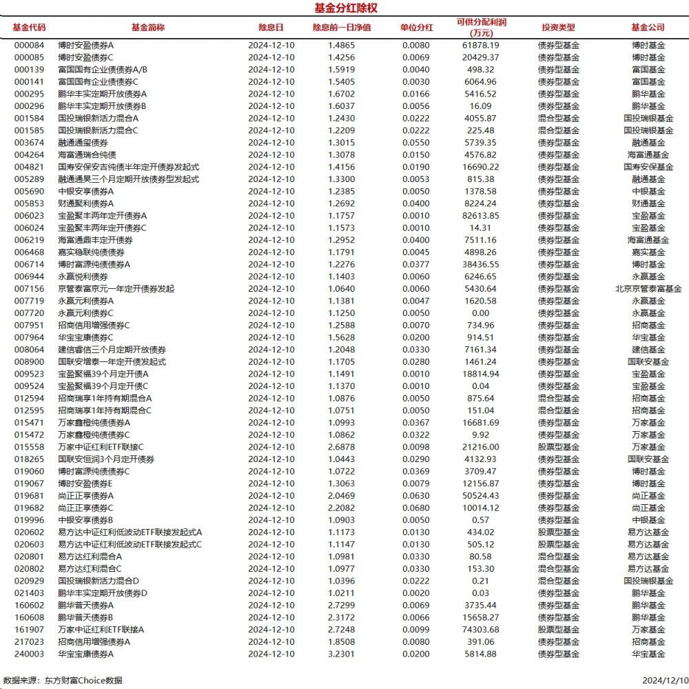 南方财经12月10日电,据东方财富Choice数据统计,今日共有51只基金分红除权(A/C类分开计算),包括40只债券型基金、7只混合型基金、4只股票型基金,累计可供分配利润53.24亿元。