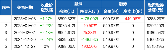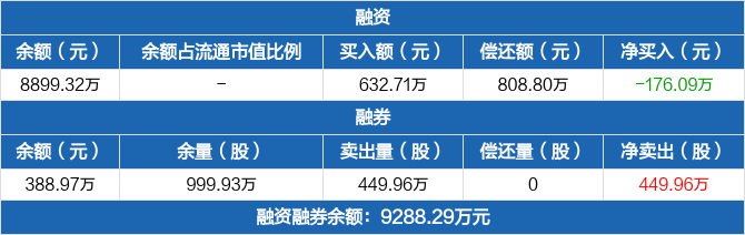 融资方面,当日融资买入632.71万元,融资偿还808.8万元,融资净偿还176.09万元。融券方面,融券卖出449.96万份,融券偿还0份,融券余量999.93万份,融券余额388.97万元。融资融券余额合计9288.29万元。