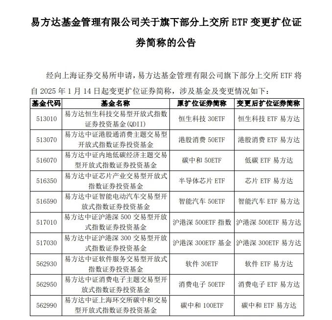根据易方达基金发布的公告,自1月14日起,对旗下10只在上交所上市的ETF和7只在深交所上市的ETF进行变更扩位证券简称,涉及多只行业主题、跨境和宽基类ETF。