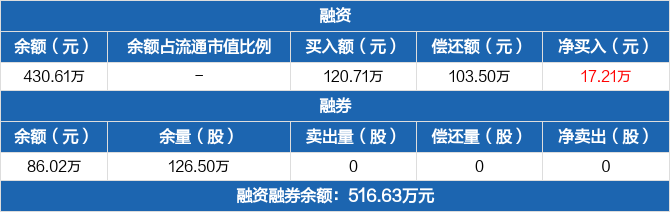 融资方面,当日融资买入120.71万元,融资偿还103.5万元,融资净买入17.21万元。融券方面,融券卖出0份,融券偿还0份,融券余量126.5万份,融券余额86.02万元。融资融券余额合计516.63万元。