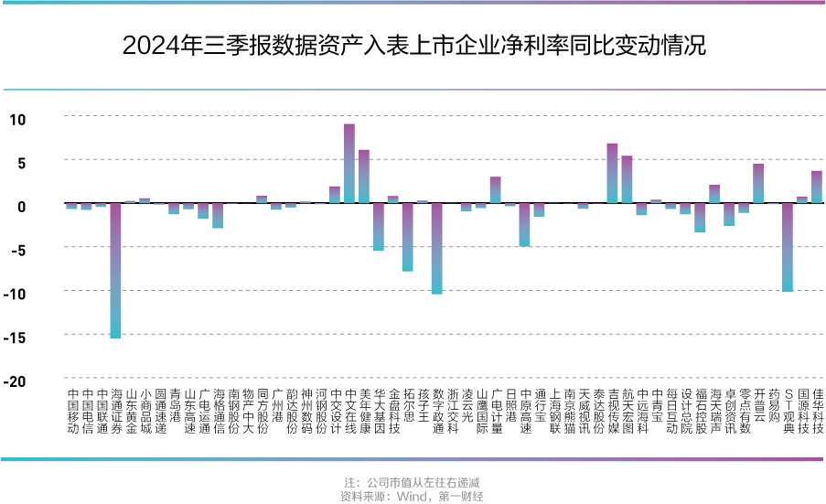 在三季报披露数据资产入表的企业中,除了三大运营商,还有海通证券(600837.SH)、山东黄金(600547.SH)两家超千亿市值的企业披露数据资产入表情况。数据资产管理一方面能够为这些大型企业提升内部管理效率,通过技术创新和数字化转型提升自身的竞争力和效率,同时作为行业龙头企业,这些企业有条件为数据资源提供丰富的应用场景,有助于数据要素价值释放。