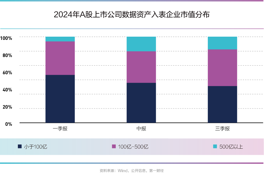从数据资产入表企业的市值分布来看,一季报大多为市值不超过500亿的中小企业,中报及三季报,越来越多市值超500亿的大型企业参与到数据资产入表的实践中。
