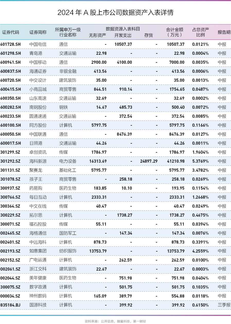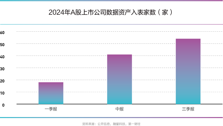 根据第一财经统计,共计54家A股上市企业在三季报中披露了企业数据资产入表情况,数据资产入表金额为10.94亿元,入表金额占总资产的比值为0.01857%。