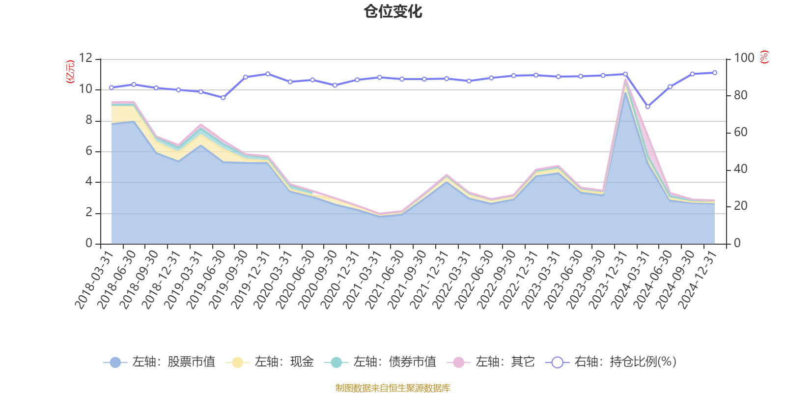 据定期报告数据统计,近三年平均股票仓位为88.98%,同类平均为88.1%。2024年末基金达到92.57%的最高仓位,2024年一季度末最低,为74.27%。