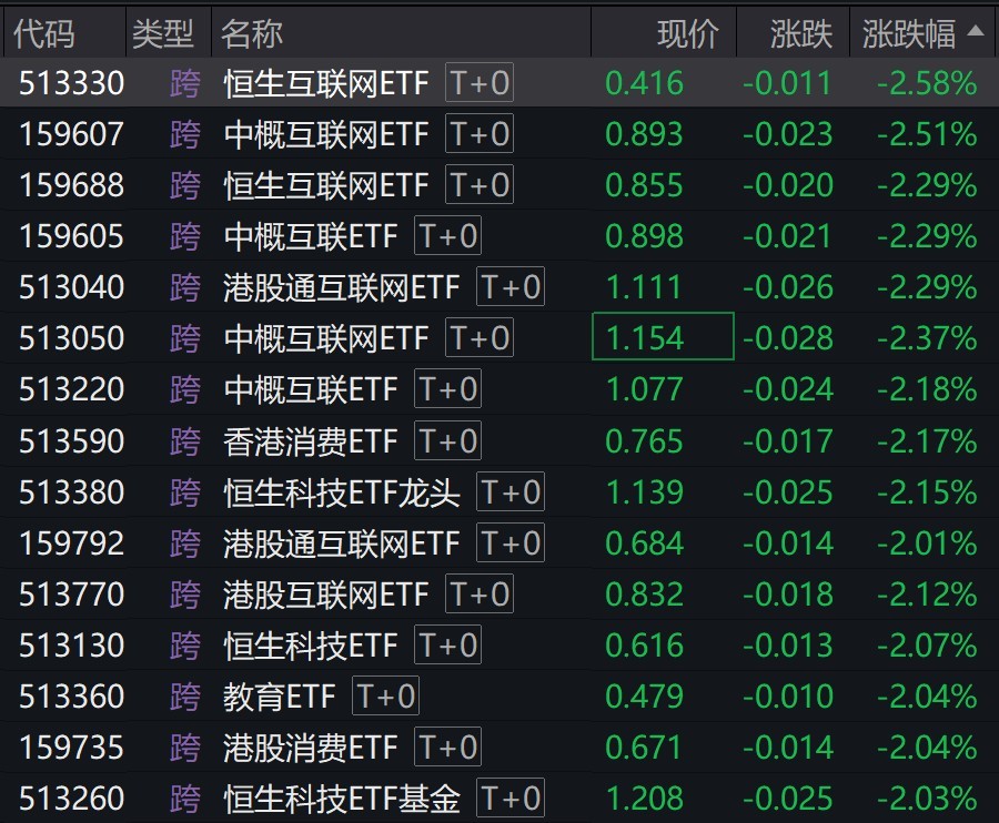 受盘面影响,恒生互联网、中概互联网等港股相关ETF普跌逾2%。