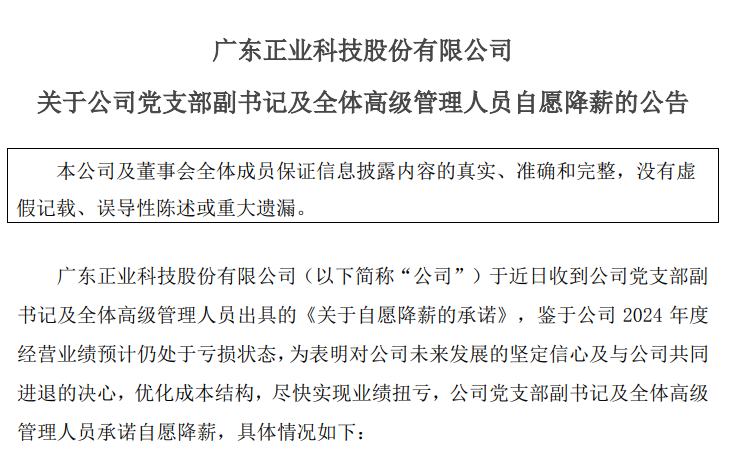 1月20日,正业科技公告称,公司近日收到公司党支部副书记及全体高级管理人员出具的《关于自愿降薪的承诺》,鉴于公司2024年度经营业绩预计仍处于亏损状态,公司党支部副书记及全体高级管理人员承诺自愿降薪,降薪幅度为各人员现任职务薪酬标准的20%。