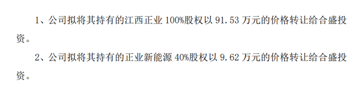 2024年11月5日,正业科技公告,将终止投资年产5GW光伏组件及8GW异质结光伏电池片生产基地项目(以下简称“光伏项目”),拟将全资子公司江西正业科技有限公司100%股权以91.53万元转让给合盛投资,拟将控股子公司正业新能源40%股权以9.62万元转让给合盛投资。