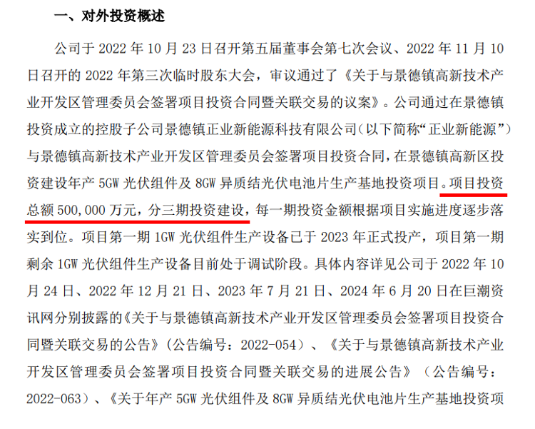 记者发现,上述光伏项目始于2022年10月,光伏项目原计划的投资总金额为50亿元,分三期投资建设。但这笔投资也令资本市场产生质疑,其核心就在于正业科技并不具备50亿元的投资能力。据该公司2022年的半年报显示,正业科技总资产仅为19.53亿元,50亿元投资是公司总资产的2.56倍。