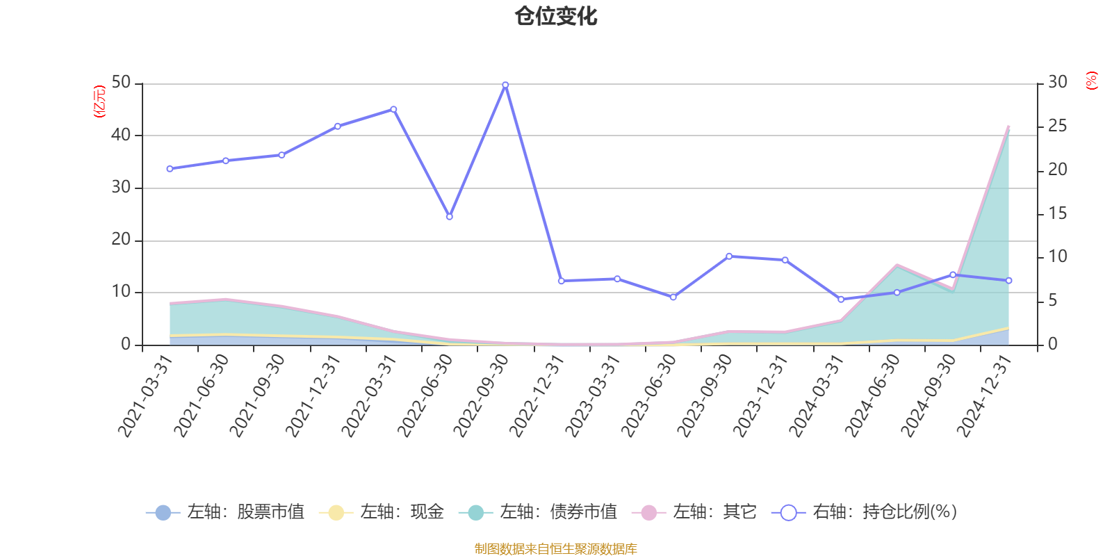 基金管理人在四季报中表示,四季度组合操作上继续股债对冲策略,权益资产随着风险偏好的变化进行相对左侧的操作,结构上继续高赔率(潜在产业周期+潜在困境反转)+高胜率(红利)的组合,转债部分顺应市场行情进行交易,仓位中枢整体较为平稳。纯债部分在把握债市β行情的基础上,基于股债跷跷板进行一定的久期波动对冲,同时逐步切换相对有性价比、流动性较好的二永债。