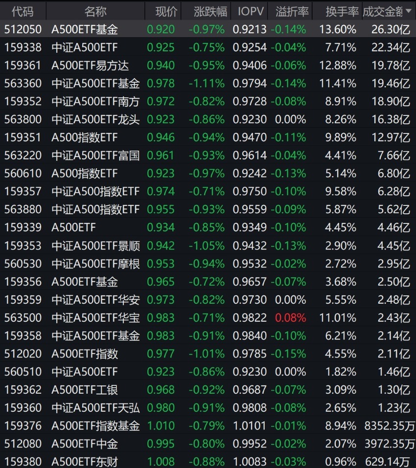 截至上午收盘,场内25只跟踪中证A500指数的ETF普跌约0.9%,其中有7只ETF成交额超10亿元,其中A500ETF基金、中证A500ETF早盘成交额分别为26.3亿元和22.34亿元。