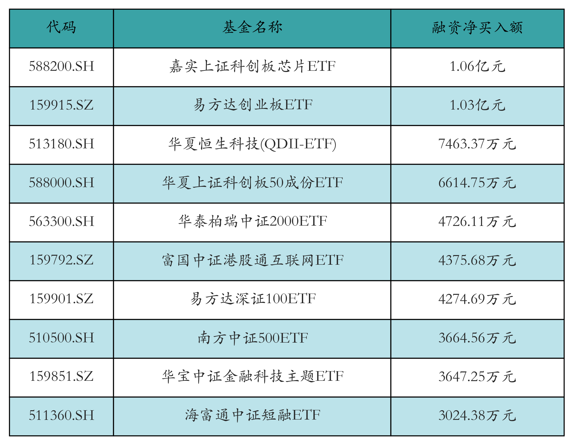 1月23日ETF融资净买入额前三位分别为:嘉实上证科创板芯片ETF(1.06亿元)、易方达创业板ETF(1.03亿元)和华夏恒生科技(QDII-ETF)(7463.37万元),前10具体见下表: