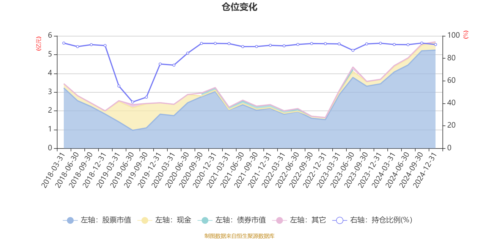 据定期报告数据统计,近三年平均股票仓位为92.19%,同类平均为84.66%。2024年三季度末基金达到93.59%的最高仓位,2019年上半年末最低,为41.19%。