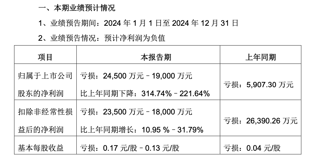 1月24日晚间,东莞勤上光电股份有限公司(以下简称“勤上股份”或“公司”)2024年度业绩预告。公司预计2024年归属于上市公司股东的净利润亏损2.45亿元–1.9亿元,同比亏损扩大;扣除非经常性损益后的净利润亏损2.35亿元–1.8亿元;基本每股收益亏损0.17元/股–0.13元/股。