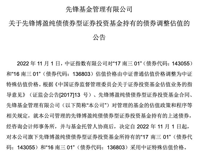 在2022年11月先锋基金发布的《关于先锋博盈纯债债券型证券投资基金持有的债券调整估值的公告》中提及,先锋博盈纯债基金持有的“17南三01”和“16南三01”的估值价格被中证指数有限公司由中证普通估值价格调整为中证特殊估值价格。