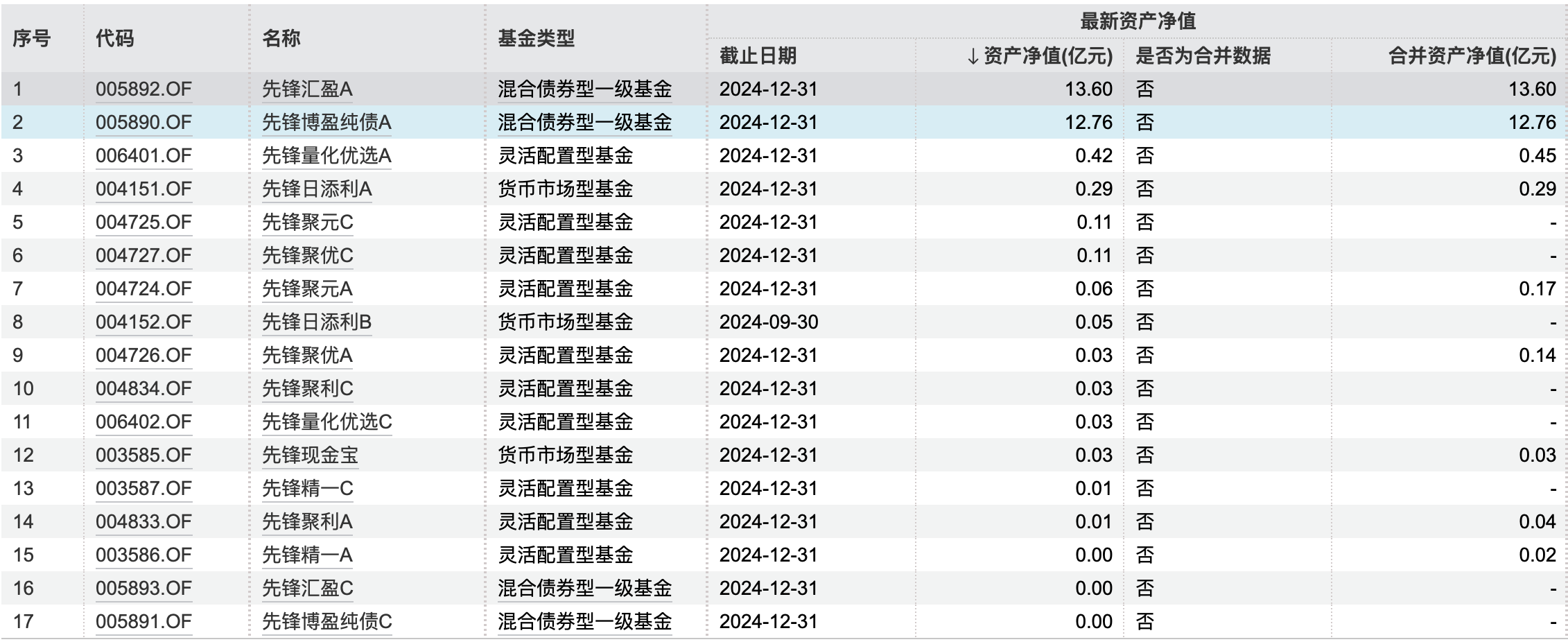 据统计,截至2024年末,先锋博盈纯债基金资产规模总计12.76亿元,汇盈纯债基金资产规模总计13.60亿元,两者相加总计26.36亿元,而先锋基金目前全部17支基金产品总共的资产规模也才27.49亿元。也就是说,先锋基金超过95%的管理规模都来自于这两支“暴雷”的纯债基金。