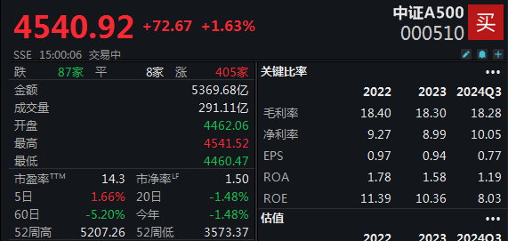 中证A500指数(000510.SH)今日收盘上涨1.63%,报4540.92点。成分股中,有405家上涨,其中,有37家涨超6%。