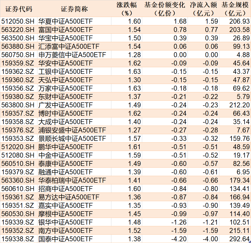 此外,上周五场内27只中证A500ETF合计净流出12.47亿元,其中有4只获得资金增持。