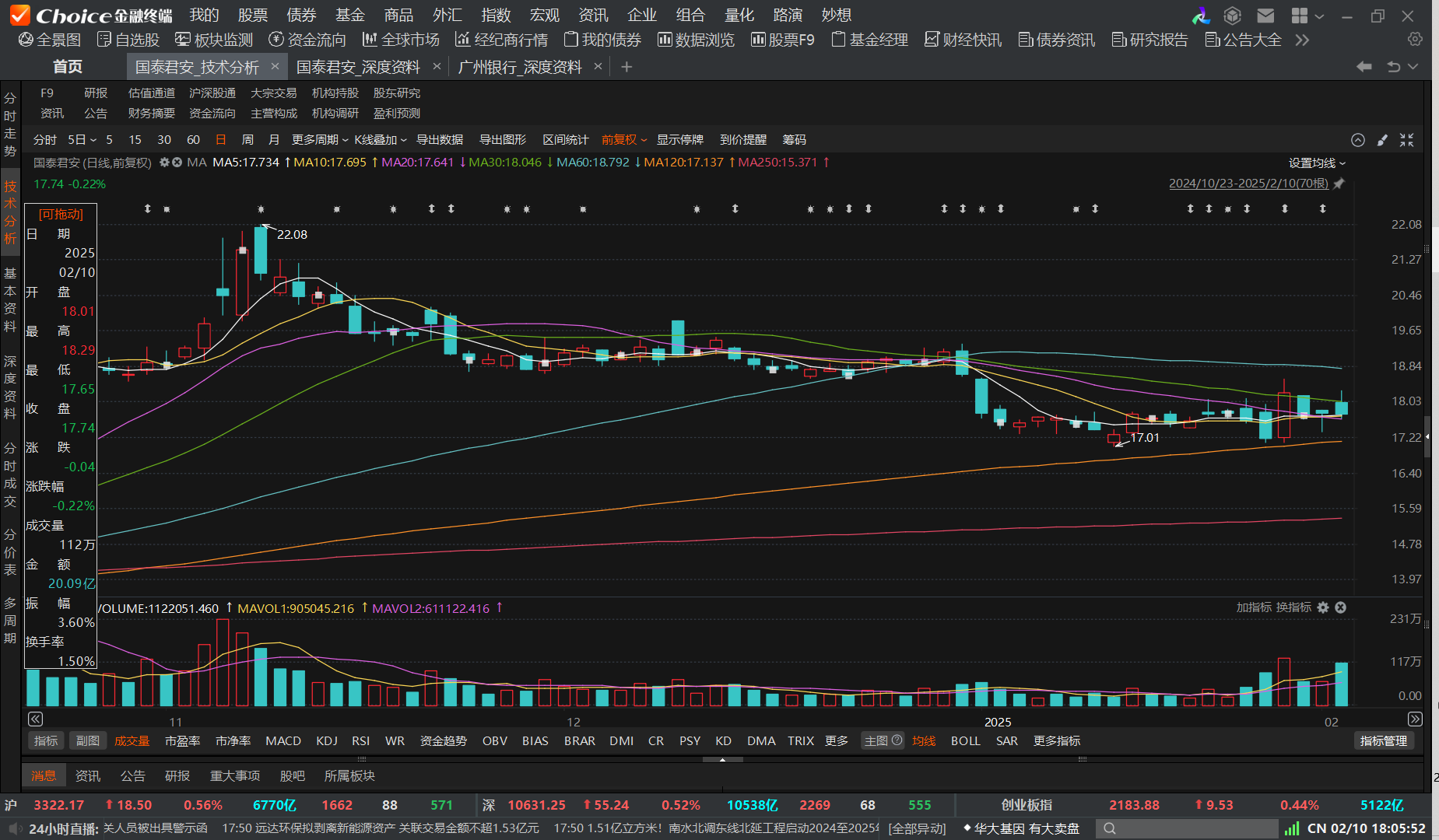 截至2月5日收盘,国泰君安报收于17.78元,2月10日,国泰君安开盘价为18.01元,当日股价呈现一定波动,最高达18.29元,最低至17.65元,最终收于17.74元,较上个交易日下跌0.04元,跌幅为0.22%,总市值达1580亿元。