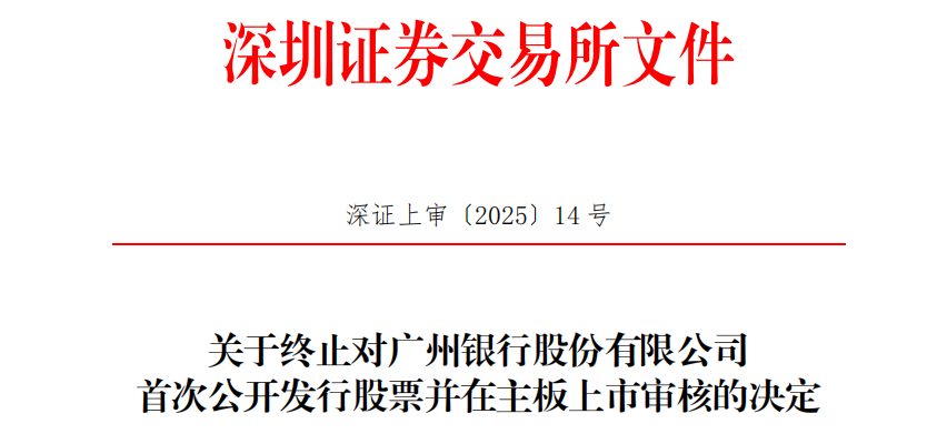 1月17日,广州银行发布公告称,广州银行、保荐人提交了撤回发行上市申请文件,根据《深圳证券交易所股票发行上市审核规则(2024年修订)》第六十二条,深交所决定终止广州银行发行上市审核。