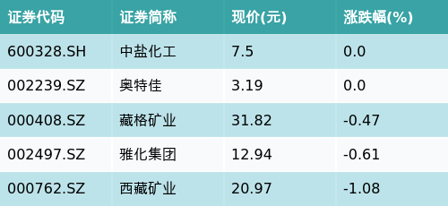 截至收盘,锂矿主题涨跌幅最高的五只股票为:中盐化工(600328.SH)、奥特佳(002239.SZ)、藏格矿业(000408.SZ)、雅化集团(002497.SZ)与西藏矿业(000762.SZ)。详情见下表: