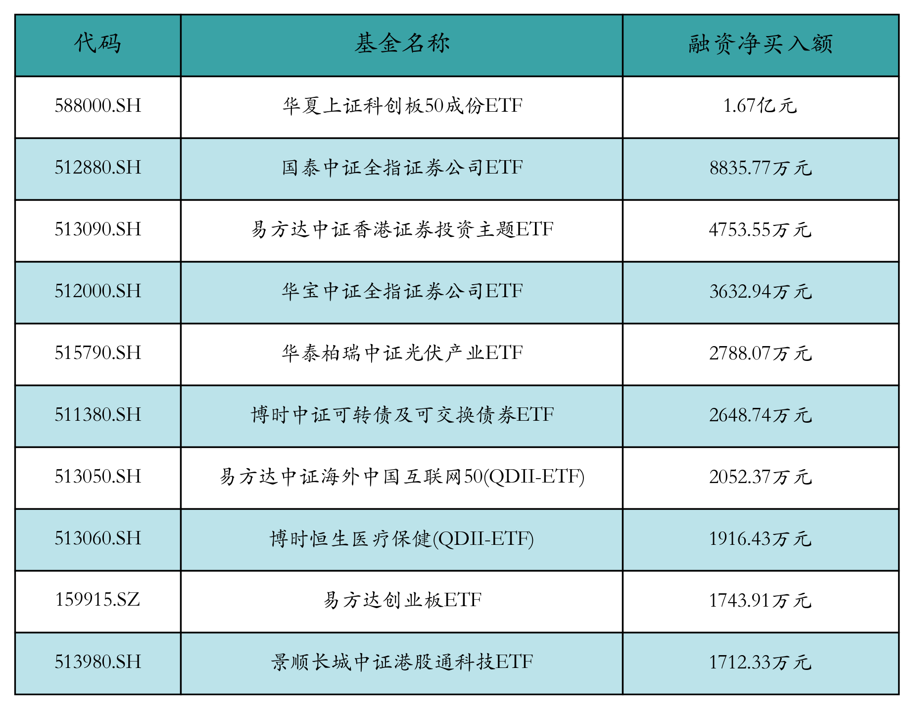 2月11日ETF融资净买入额前三位分别为:华夏上证科创板50成份ETF(1.67亿元)、国泰中证全指证券公司ETF(8835.77万元)和易方达中证香港证券投资主题ETF(4753.55万元),前10具体见下表: