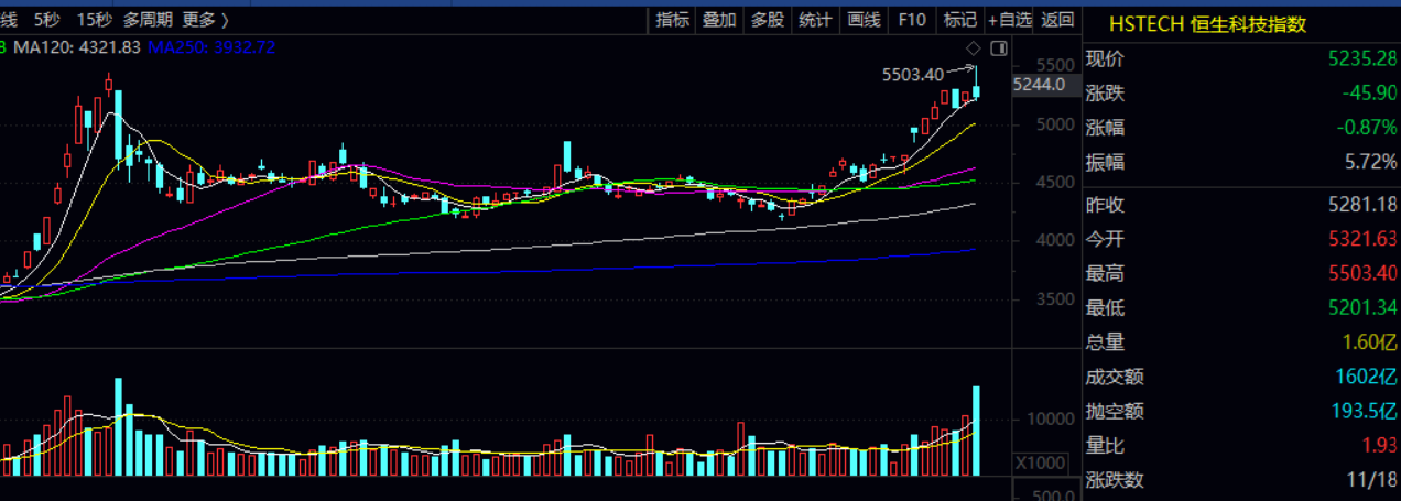 今日交易时段,恒生科技指数先是震荡上升,午后最高冲至5503.4点,随后快速回落。截至收盘,反而下跌0.87%。