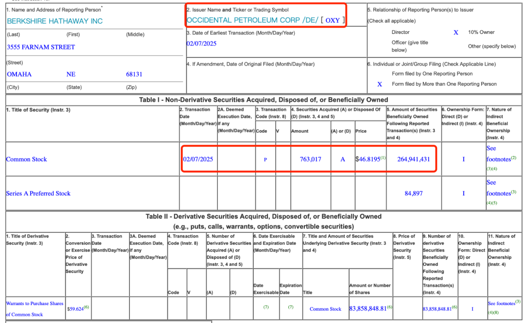 近期,美国证券交易委员会(SEC)披露的一份文件显示,伯克希尔哈撒韦公司于今年2月7日以46.8195美元/股的平均价格,小幅增持了76.30万股西方石油普通股,耗资约3572万美元。