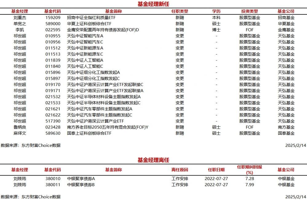 每经AI快讯,据东方财富Choice数据统计,今日新聘基金经理6人,涉及20只基金(A/C类分开计算),主要来自天弘基金、招商基金等公司。另外,今日有1位基金经理离任。