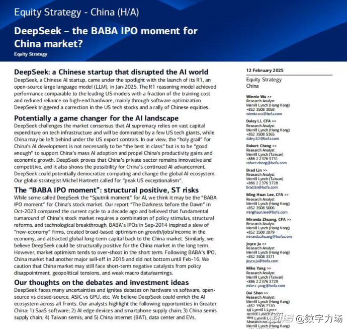 美国银行报告说,DeepSeek的出现,是中国股市的“阿里IPO时刻”,可能在长期内对中国股市产生结构性积极影响。