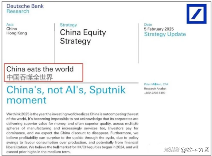 德银分析师彼得·米利肯在报告中写道:“我们认为,2025年将是全球投资界意识到中国超越其他国家竞争力的一年。在2025年,中国在一周内发布了世界首款第六代战斗机和极低成本+高性能的开源AI大模型DeepSeek。”