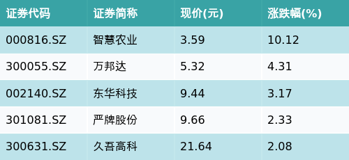 截至收盘,盐湖提锂主题涨跌幅最高的五只股票为:智慧农业(000816.SZ)、万邦达(300055.SZ)、东华科技(002140.SZ)、严牌股份(301081.SZ)与久吾高科(300631.SZ)。详情见下表: