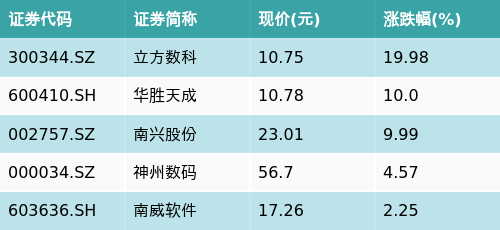 截至收盘,东数西算主题涨跌幅最高的五只股票为:立方数科(300344.SZ)、华胜天成(600410.SH)、南兴股份(002757.SZ)、神州数码(000034.SZ)与南威软件(603636.SH)。详情见下表: