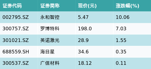截至收盘,BC电池主题涨跌幅最高的五只股票为:永和智控(002795.SZ)、罗博特科(300757.SZ)、英诺激光(301021.SZ)、海目星(688559.SH)与广信材料(300537.SZ)。详情见下表: