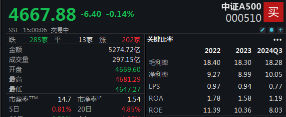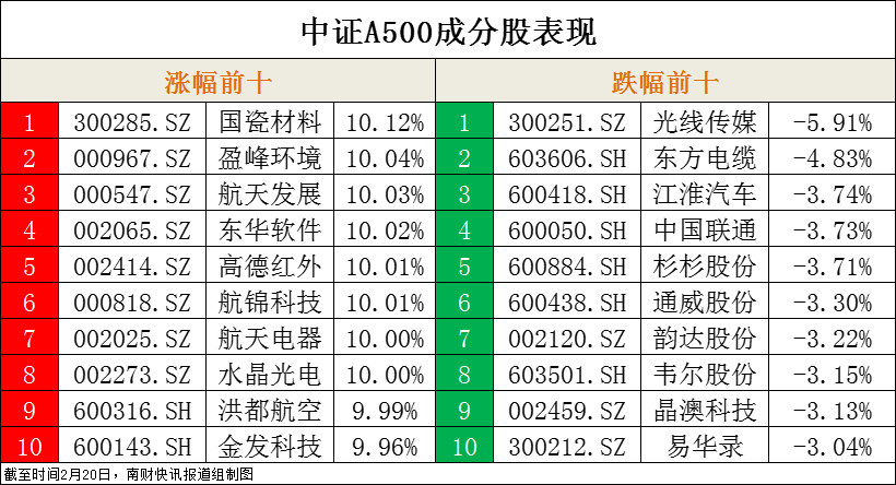 2月20日,市场全天探底回升,三大指数涨跌不一。沪深两市全天成交额1.76万亿元,较上个交易日放量356亿元。中证A500指数(000510.SH)今日收盘下跌0.14%,报4667.88。成分股中,有285家下跌。