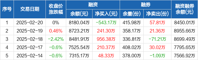 2025年2月20日旅游ETF融资净偿还543.17万元,融资余额8180.04万元