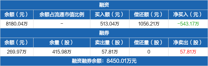融资方面,当日融资买入513.04万元,融资偿还1056.21万元,融资净偿还543.17万元。融券方面,融券卖出57.81万份,融券偿还0份,融券余量415.98万份,融券余额269.97万元。融资融券余额合计8450.01万元。